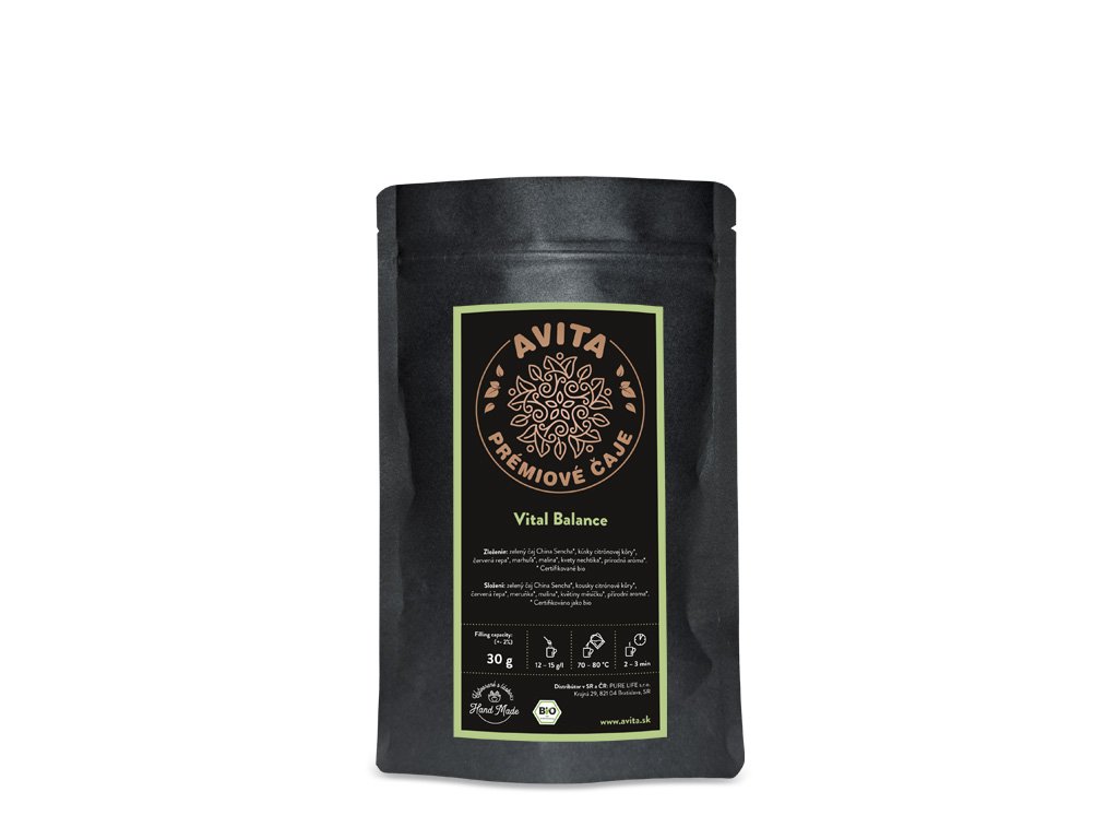 Organický sypaný zelený čaj Vital Balance spája jemnú chuť čínskeho zeleného čaju Sencha so sladkou marhuľou a malinou – v dokonale vyváženej zmesi, ktorá povzbudí telo aj myseľ.